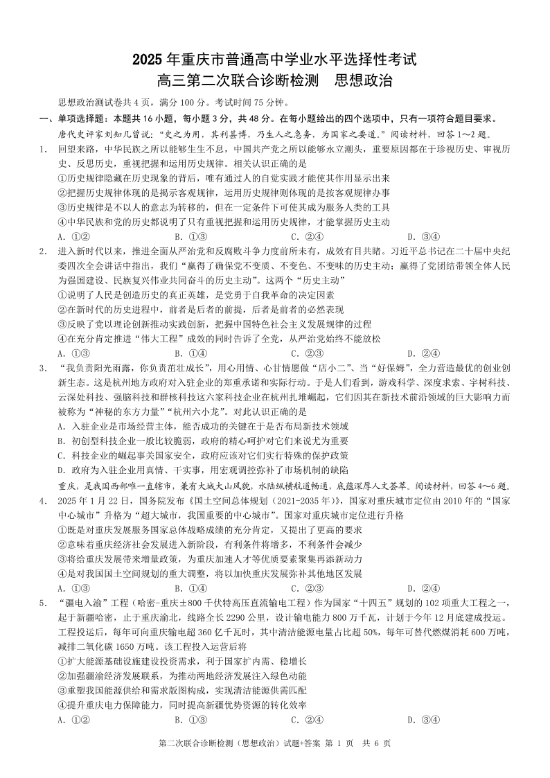 重庆市康德卷2024-2025学年全国高考高三二诊检测政治