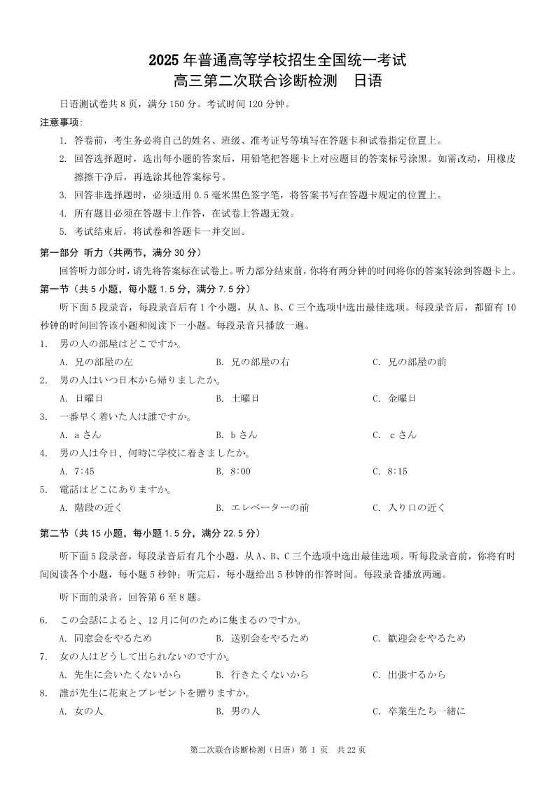 重庆市康德卷2024-2025学年全国高考高三二诊检测日语