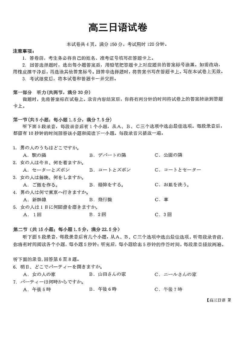 贵州省2024-2025学年下学期4月高三适应性考试日语