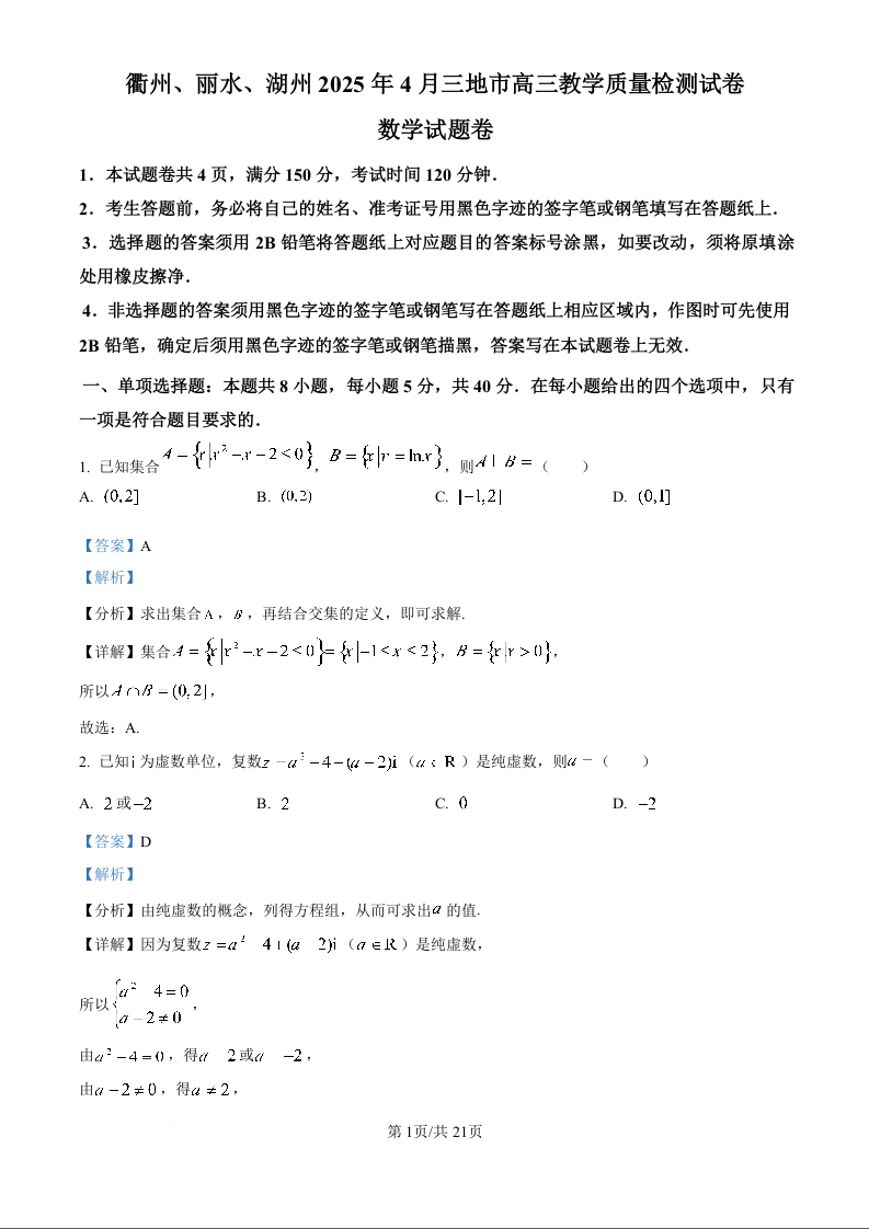 浙江省(衢丽湖)三地市2024-2025学年下学期4月高三模拟检测数学(精品解析版)