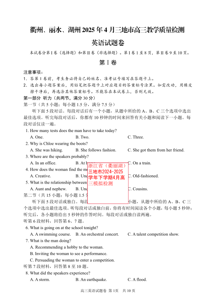 浙江省(衢丽湖)三地市2024-2025学年下学期4月高三模拟检测英语