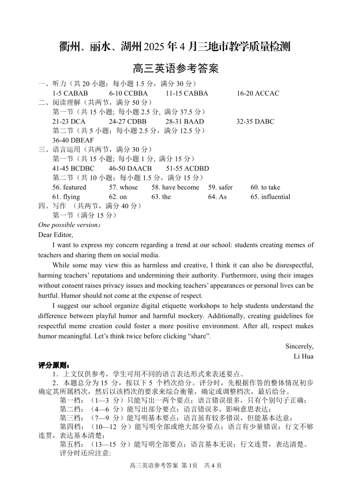 浙江省(衢丽湖)三地市2024-2025学年下学期4月高三模拟检测英语答案