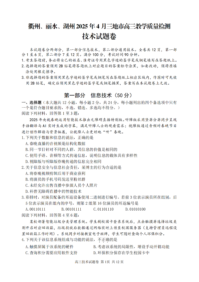 浙江省(衢丽湖)三地市2024-2025学年下学期4月高三模拟检测技术+答案
