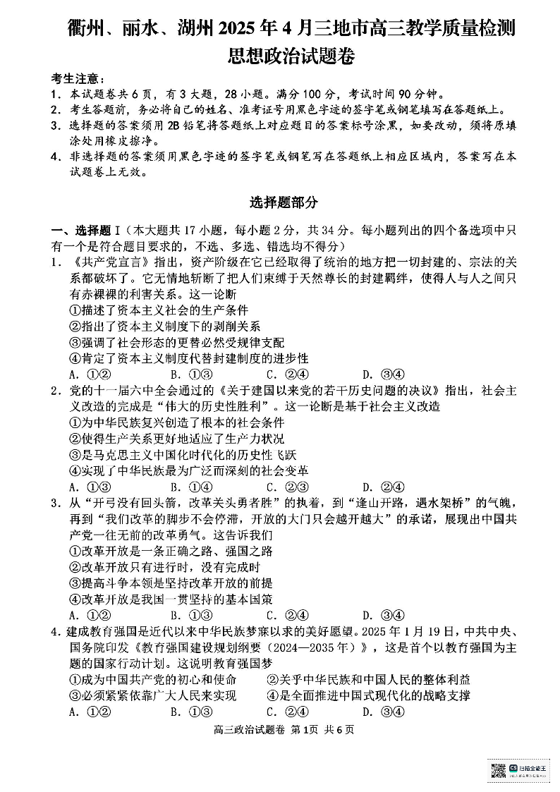 浙江省(衢丽湖)三地市2024-2025学年下学期4月高三模拟检测政治+答案