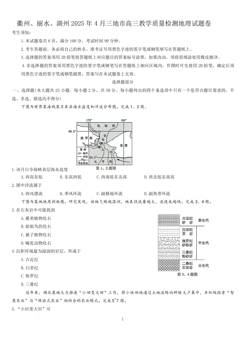 浙江省(衢丽湖)三地市2024-2025学年下学期4月高三模拟检测地理+答案