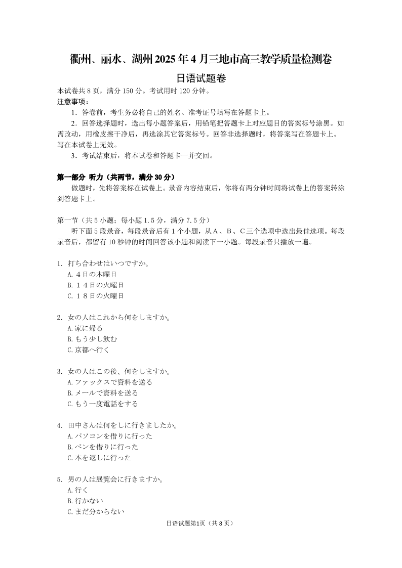 浙江省(衢丽湖)三地市2024-2025学年下学期4月高三模拟检测日语