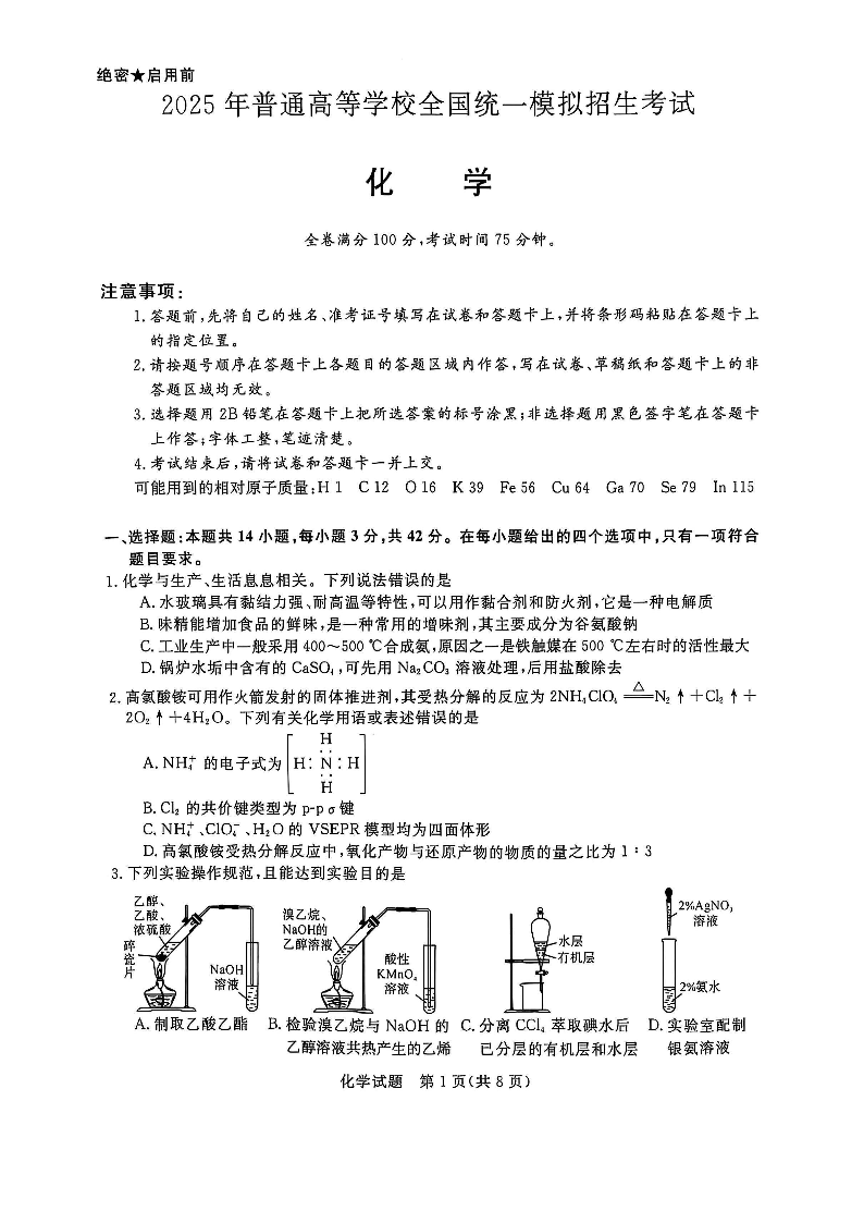 河南省金科新未来大联考2024-2025学年下学期4月高三模拟预测化学