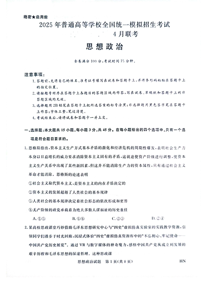河南省金科新未来大联考2024-2025学年下学期4月高三模拟预测政治