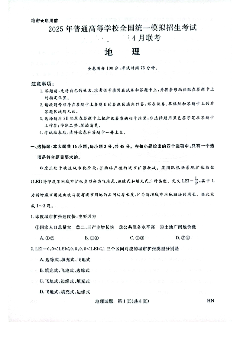 河南省金科新未来大联考2024-2025学年下学期4月高三模拟预测地理