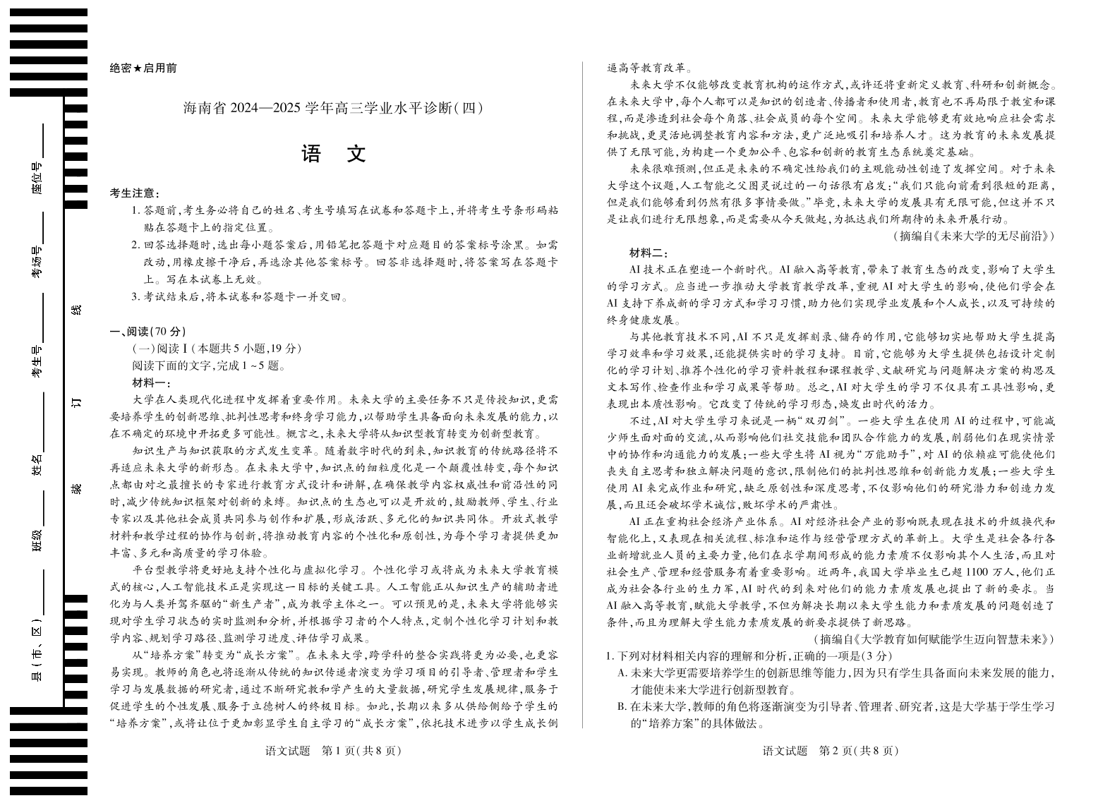 海南省区域高中2024-2025学年下学期高三高三学业水平诊断(四)语文