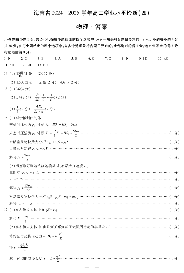 海南省区域高中2024-2025学年下学期高三高三学业水平诊断(四)物理答案