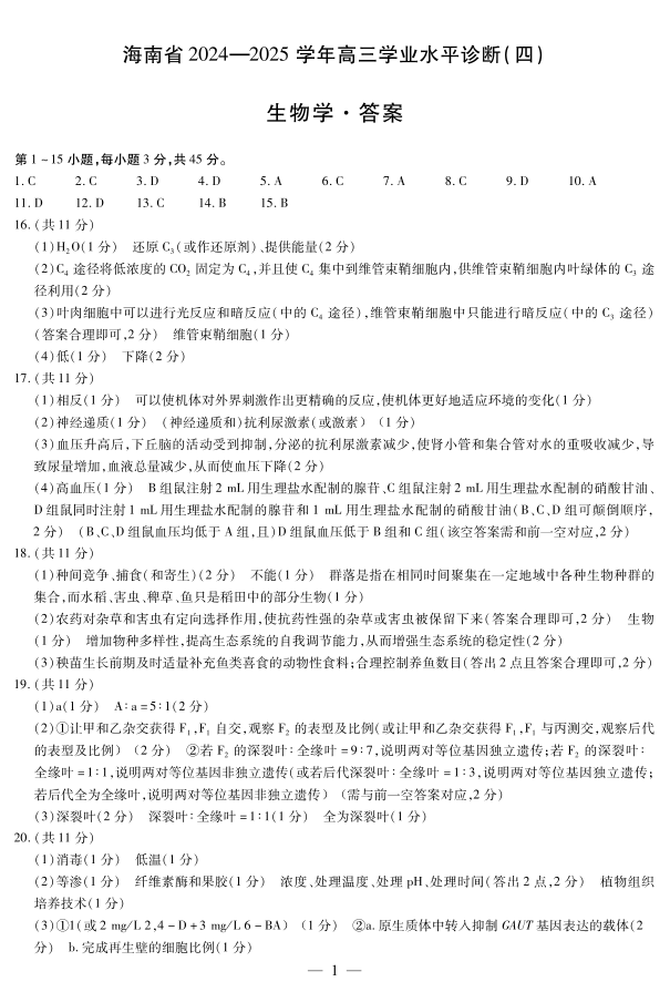 海南省区域高中2024-2025学年下学期高三高三学业水平诊断(四)生物答案