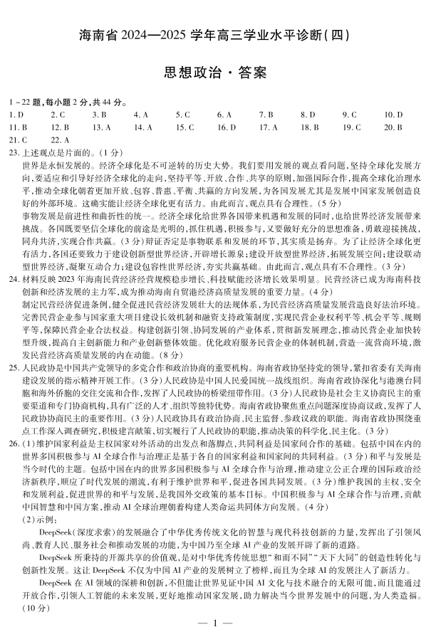 海南省区域高中2024-2025学年下学期高三高三学业水平诊断(四)政治答案