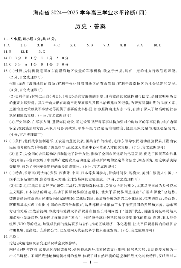 海南省区域高中2024-2025学年下学期高三高三学业水平诊断(四)历史答案