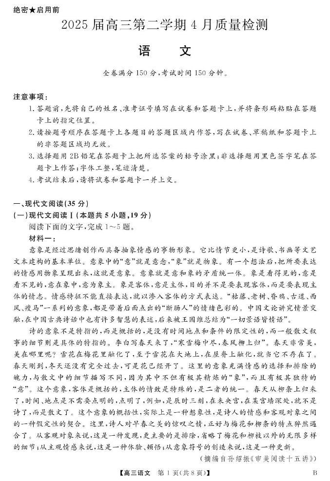 安徽华师联盟(师大附中)2024-2025学年下学期4月高三质量检测语文+答案
