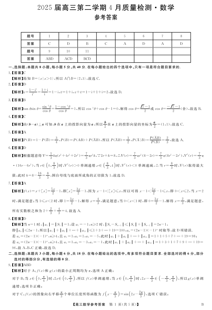 安徽华师联盟(师大附中)2024-2025学年下学期4月高三质量检测数学答案