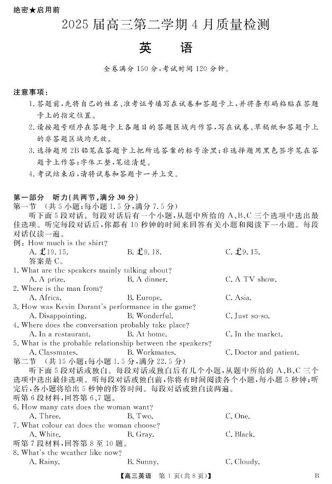 安徽华师联盟(师大附中)2024-2025学年下学期4月高三质量检测英语+答案