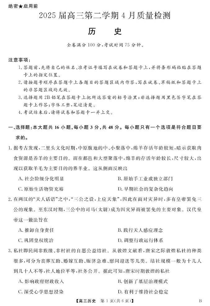 安徽华师联盟(师大附中)2024-2025学年下学期4月高三质量检测历史+答案