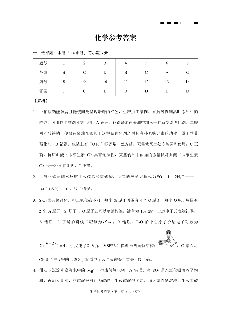 重庆市巴蜀中学2024-2025学年高三高考适应性月考卷(七)化学答案