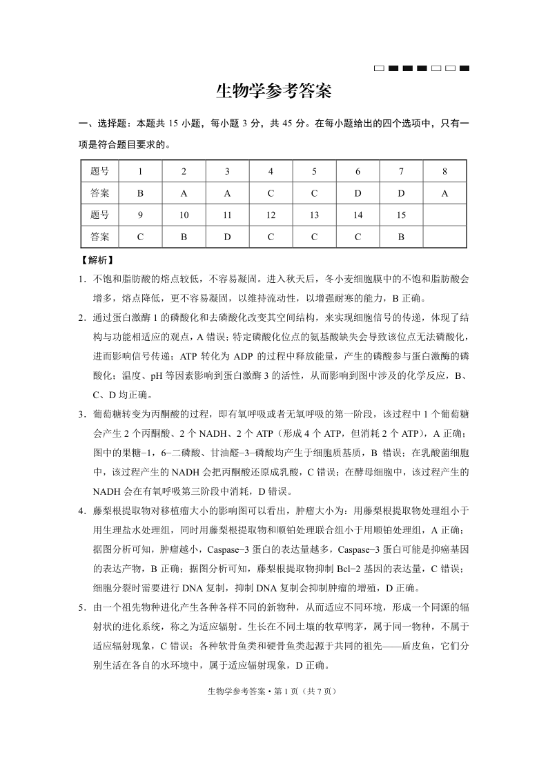 重庆市巴蜀中学2024-2025学年高三高考适应性月考卷(七)生物答案