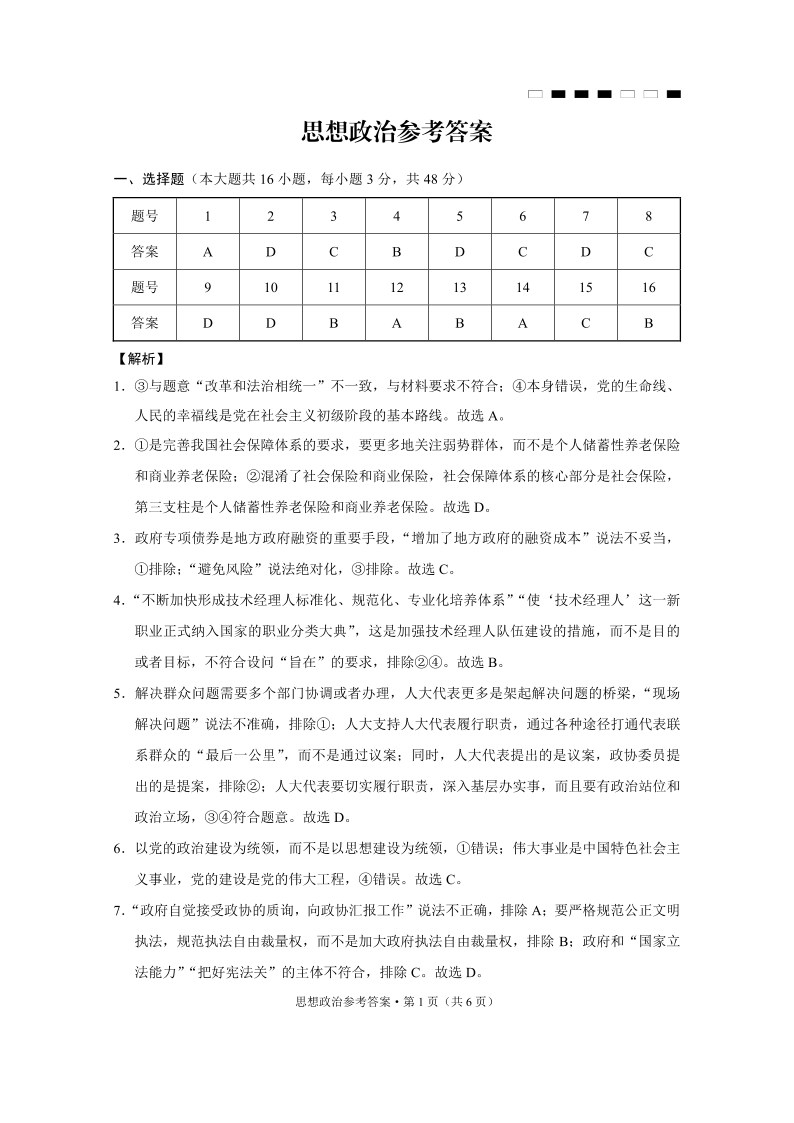 重庆市巴蜀中学2024-2025学年高三高考适应性月考卷(七)政治答案