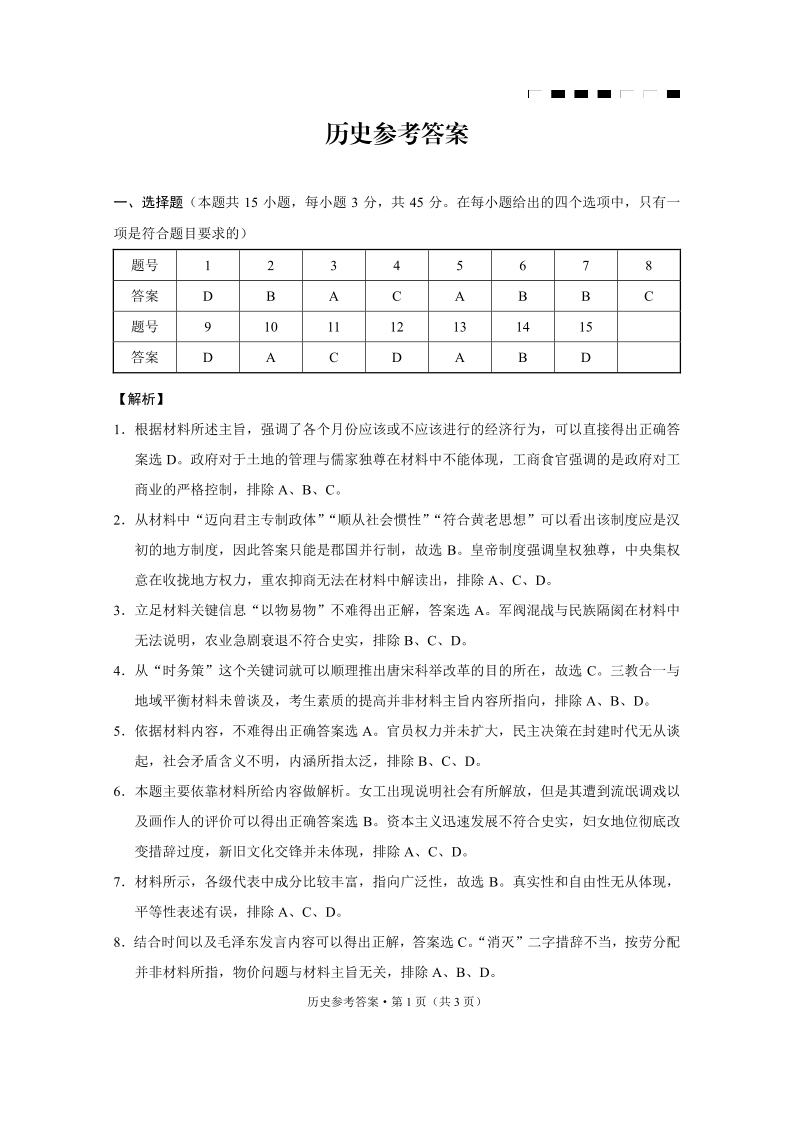 重庆市巴蜀中学2024-2025学年高三高考适应性月考卷(七)历史答案