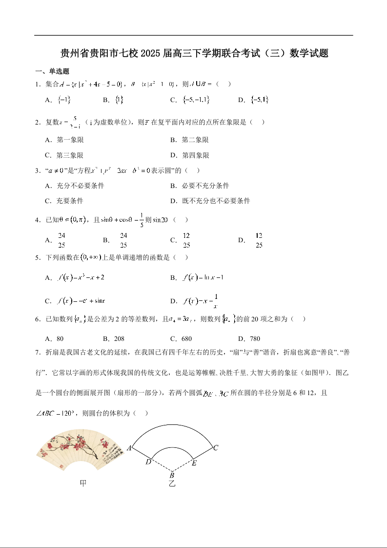 贵州省贵阳市七校2024-2025学年下学期高三联考(三)数学+答案