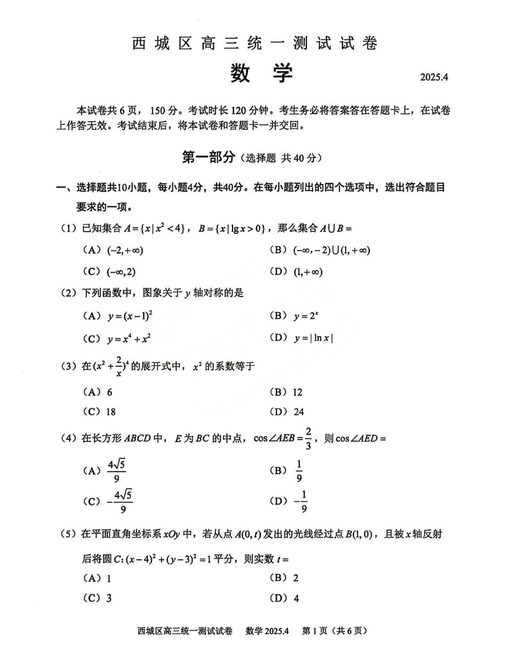 北京市西城区2024-2025学年下学期高三一模数学+答案