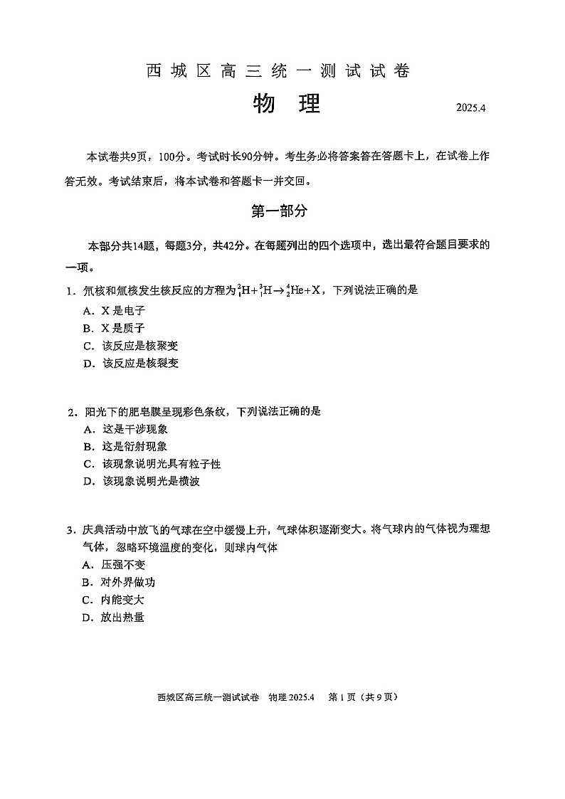 北京市西城区2024-2025学年下学期高三一模物理+答案