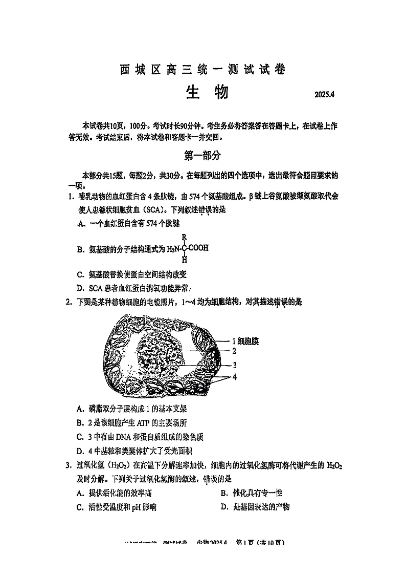 北京市西城区2024-2025学年下学期高三一模生物+答案