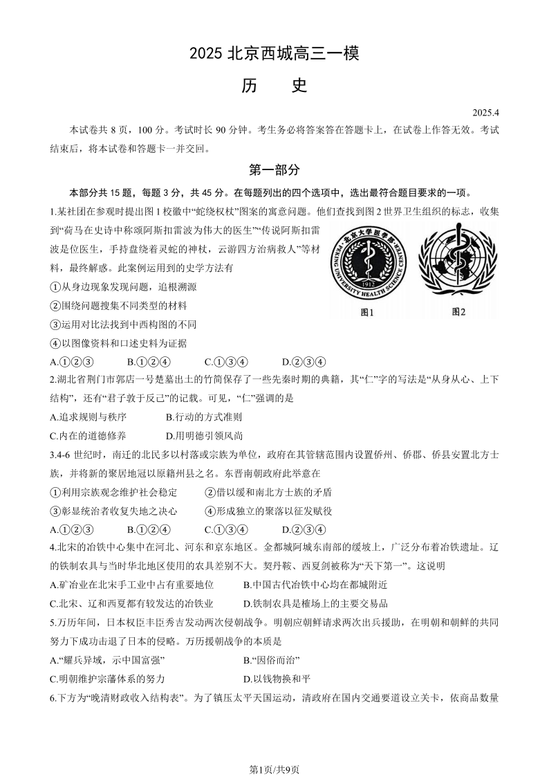 北京市西城区2024-2025学年下学期高三一模历史+答案