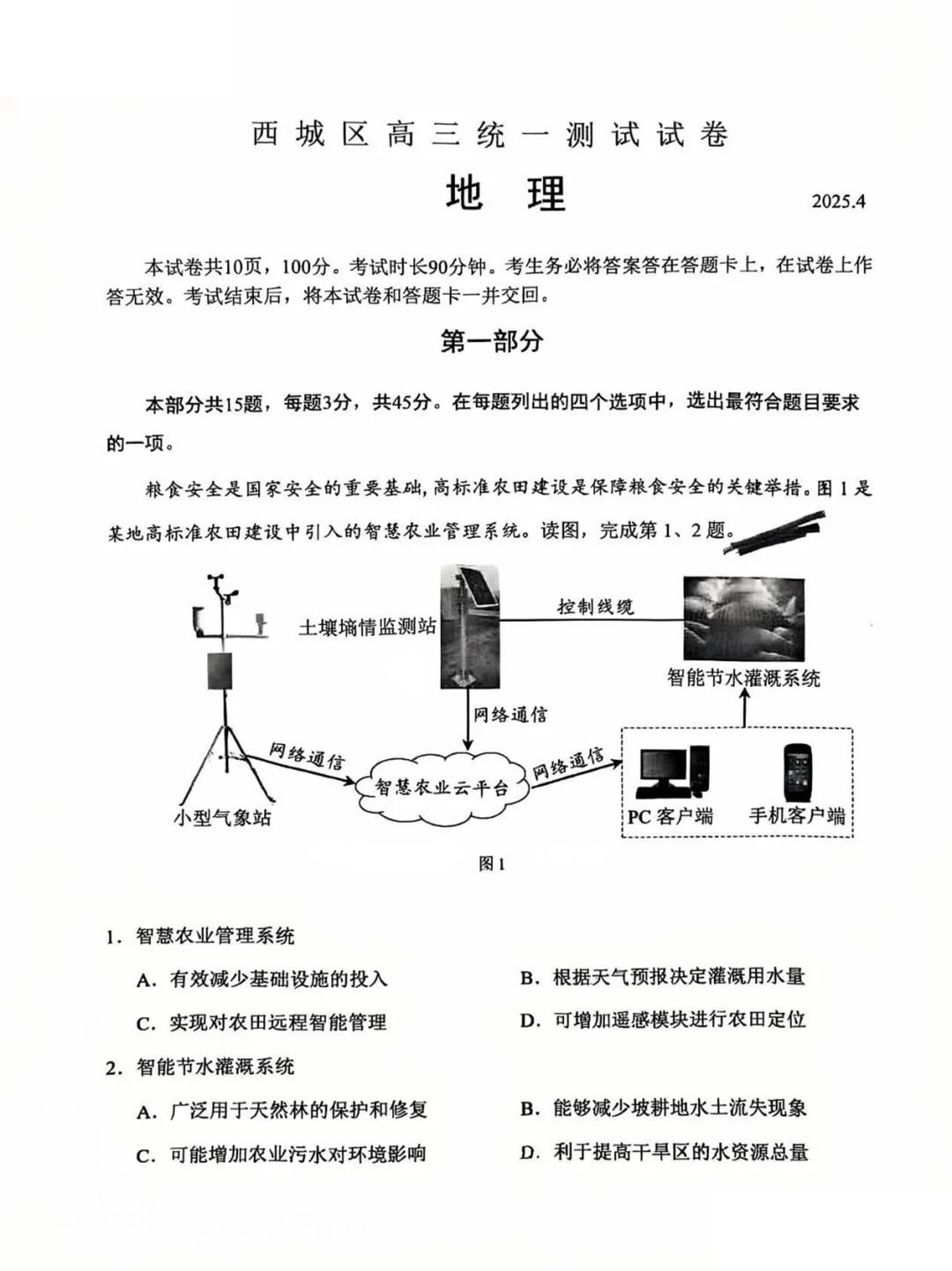北京市西城区2024-2025学年下学期高三一模地理+答案