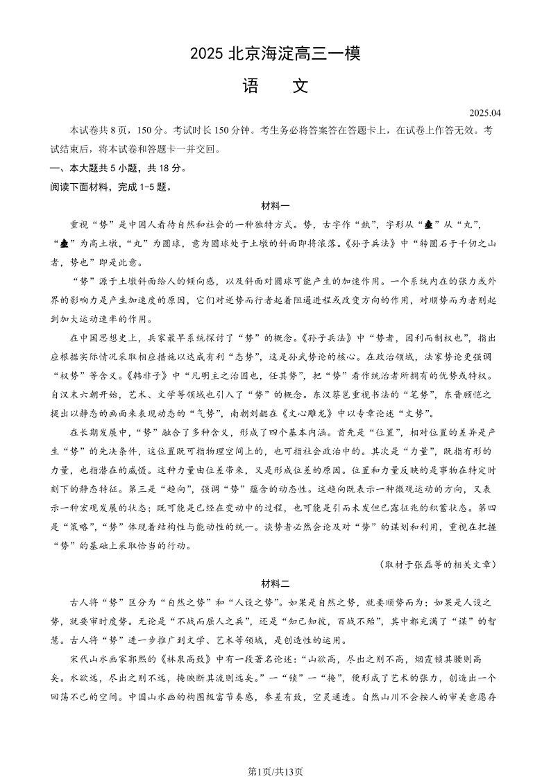 北京市海淀区2024-2025学年下学期高三一模语文+答案