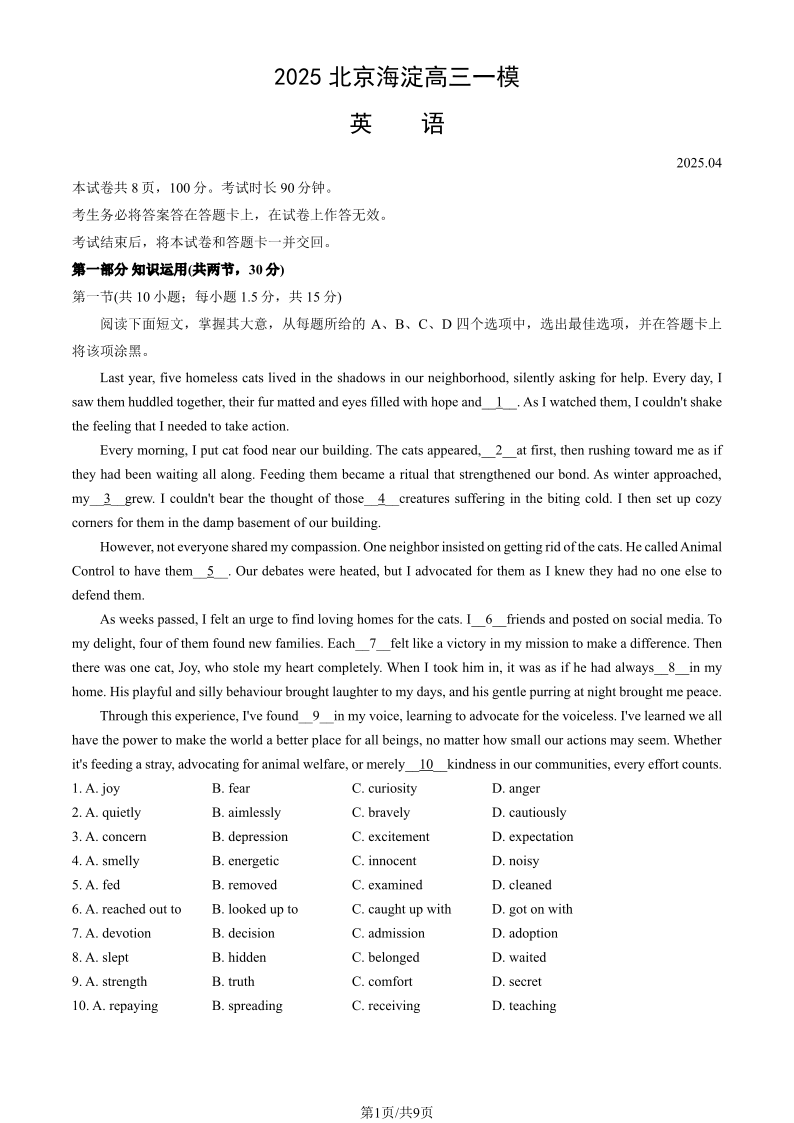 北京市海淀区2024-2025学年下学期高三一模英语+答案