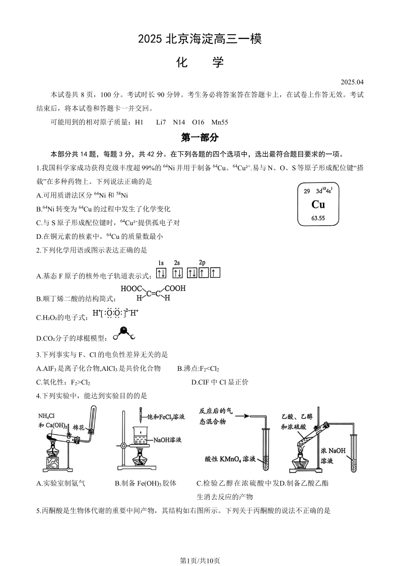 北京市海淀区2024-2025学年下学期高三一模化学+答案