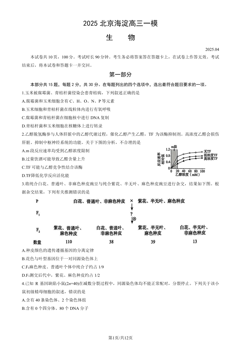 北京市海淀区2024-2025学年下学期高三一模生物+答案