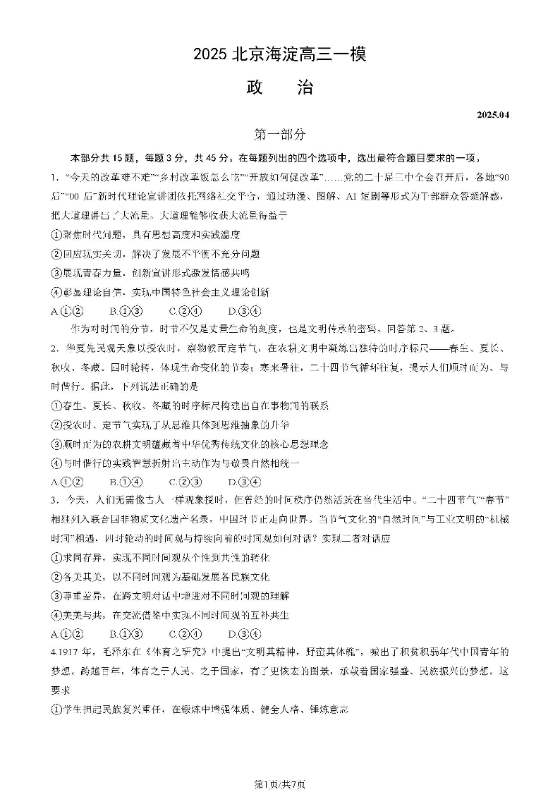 北京市海淀区2024-2025学年下学期高三一模政治+答案