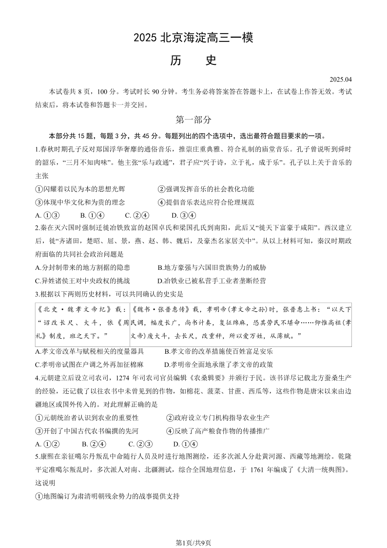 北京市海淀区2024-2025学年下学期高三一模历史+答案