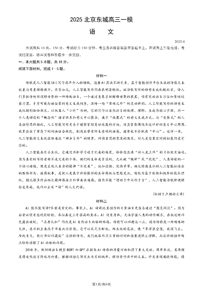 北京市东城区2024-2025学年下学期高三一模语文+答案
