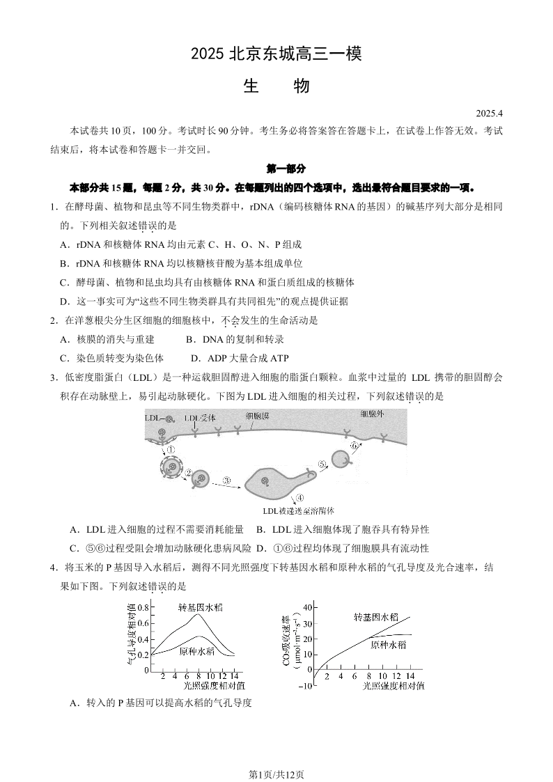 北京市东城区2024-2025学年下学期高三一模生物+答案