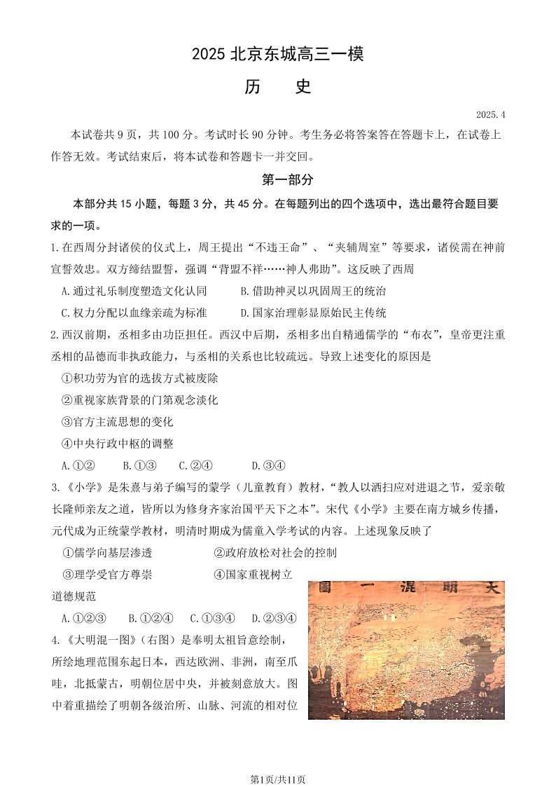 北京市东城区2024-2025学年下学期高三一模历史+答案