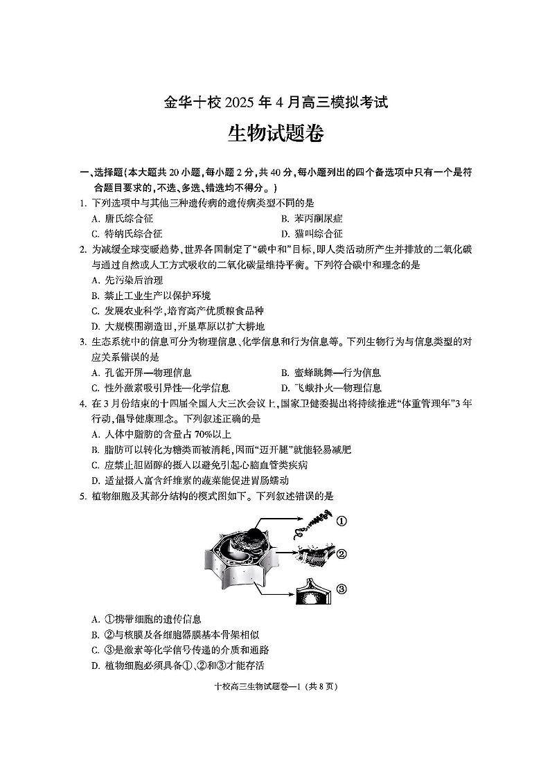 浙江省金华十校2024-2025学年下学期4月高三模拟考试生物+答案