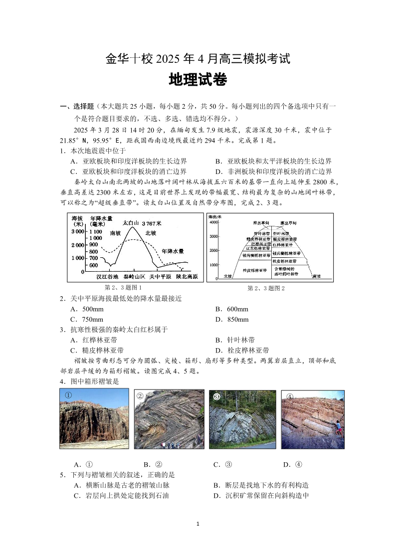 浙江省金华十校2024-2025学年下学期4月高三模拟考试地理+答案