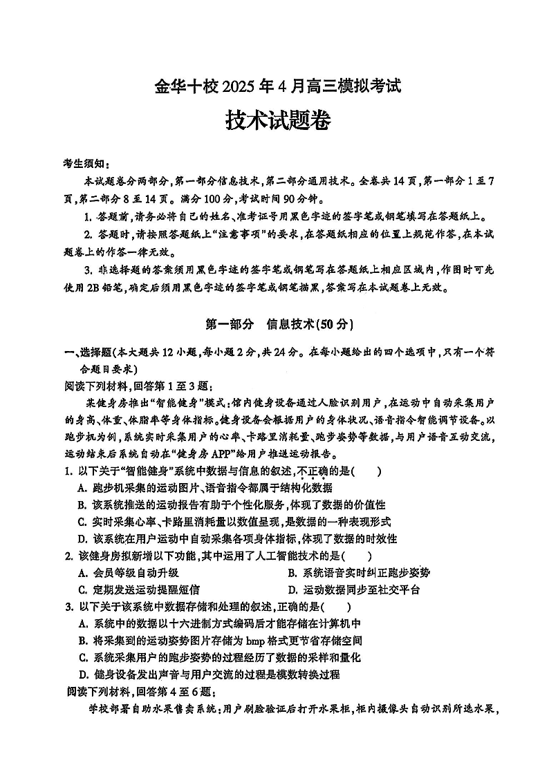 浙江省金华十校2024-2025学年下学期4月高三模拟考试技术+答案