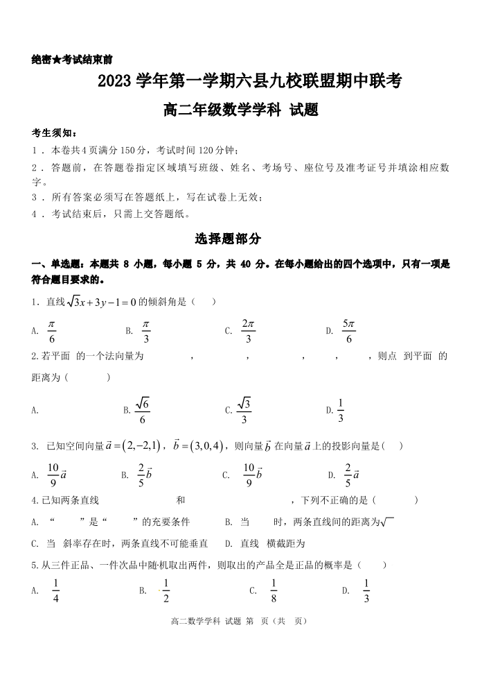 浙江省杭州市六县九校2023-2024学年高二上学期11月期中试题数学