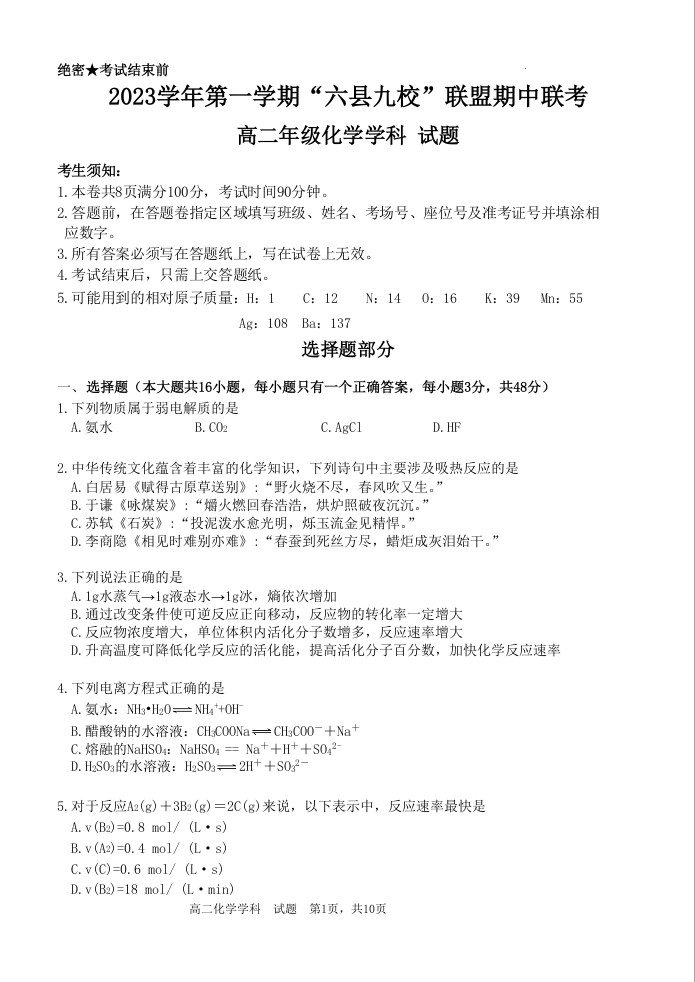 浙江省杭州市六县九校2023-2024学年高二上学期11月期中试题化学