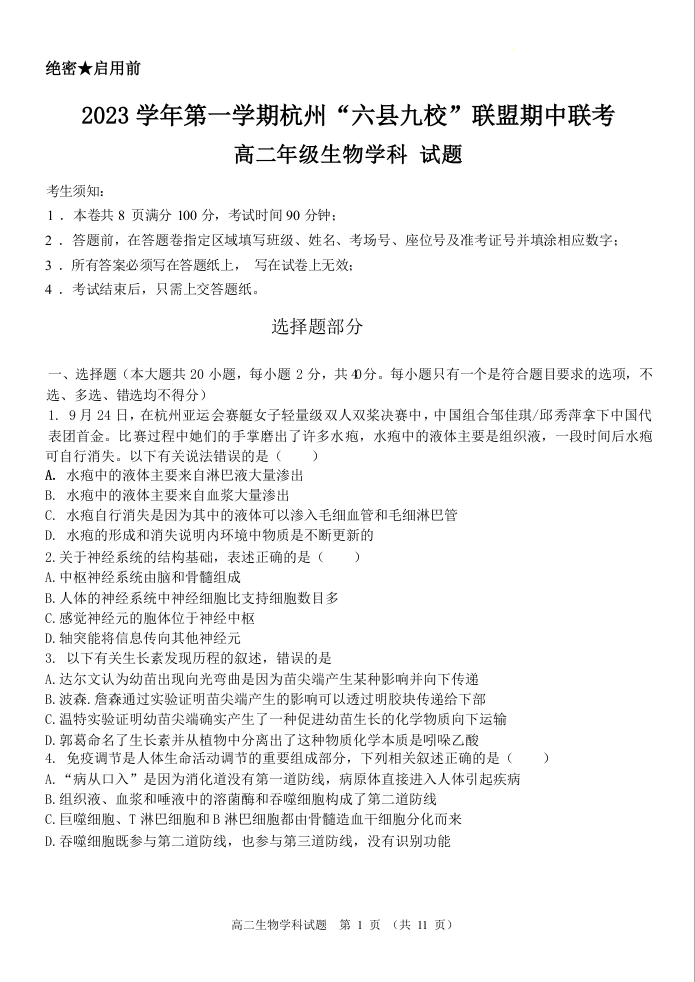 浙江省杭州市六县九校2023-2024学年高二上学期11月期中试题生物