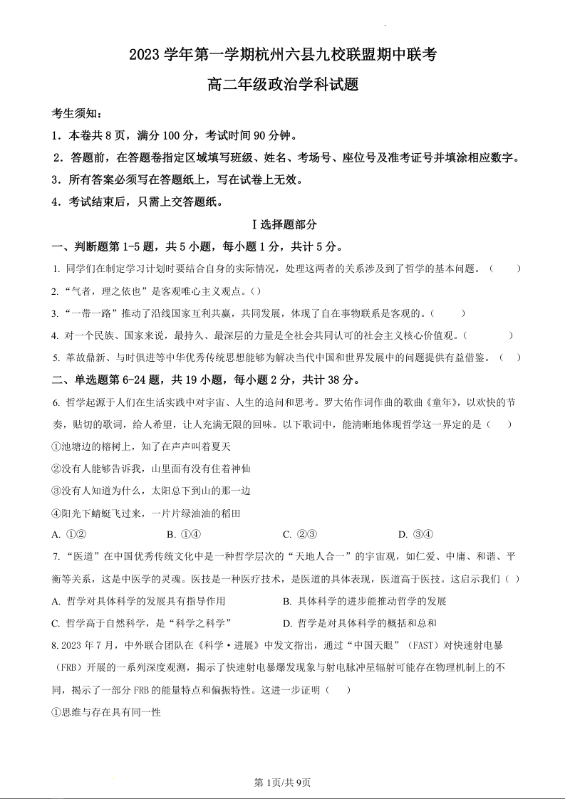 浙江省杭州市六县九校2023-2024学年高二上学期11月期中试题政治(原卷版)