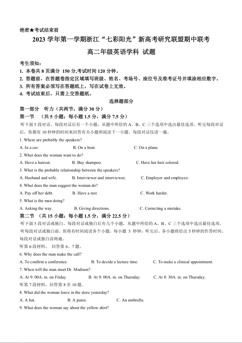 浙江省七彩阳光新高考研究联盟2023-2024学年高二上学期11月期中试题英语