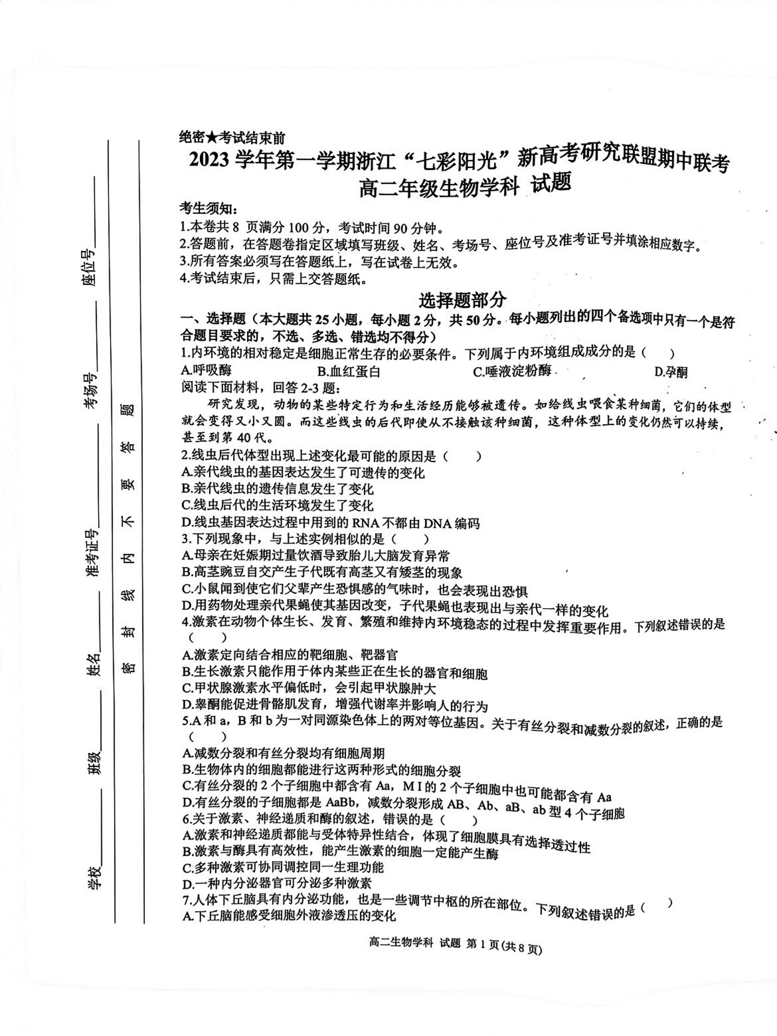 浙江省七彩阳光新高考研究联盟2023-2024学年高二上学期11月期中试题生物